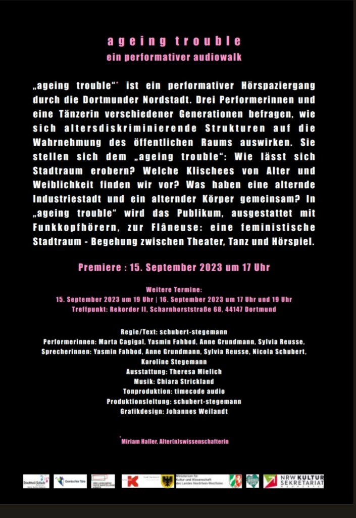 Die beiden Künstlerinnen haben sich von meinen Artikeln über „Ageing Trouble“ inspirieren lassen und einen performativen Rundgang durch die Dortmunder Nordstadt entwickelt.